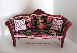 AIM member Julia Jeffreys of Bear Cabin Miniatures has recently made some tentative steps into the world of 24th scale. Julia's first passion in miniatures is 12th scale 'blackwork' embroidery, but recently she explained that she has been turning her needle to the smaller 24th scale. Shown above are her 24th scale cushions which are a little smaller than a penny coin and below are some of her original 12th scale 'blackwork' cushions photographed on one of her popular reupholstered Victorian style sofas.